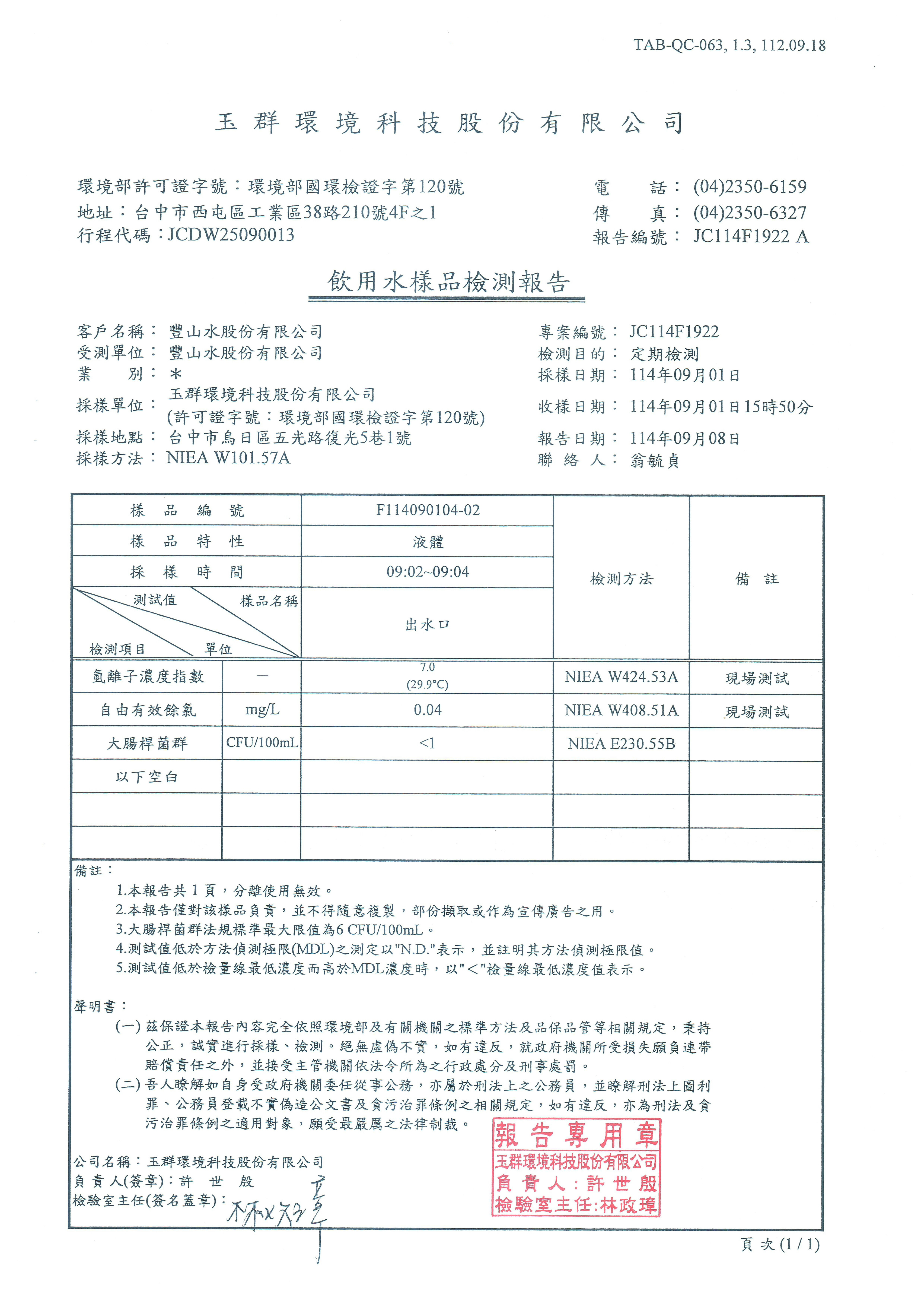 2025年9月份水質檢驗報告 專營:彰化桶裝水/台中桶裝水/南投桶裝水/桶裝水宅配/歡迎來電洽詢