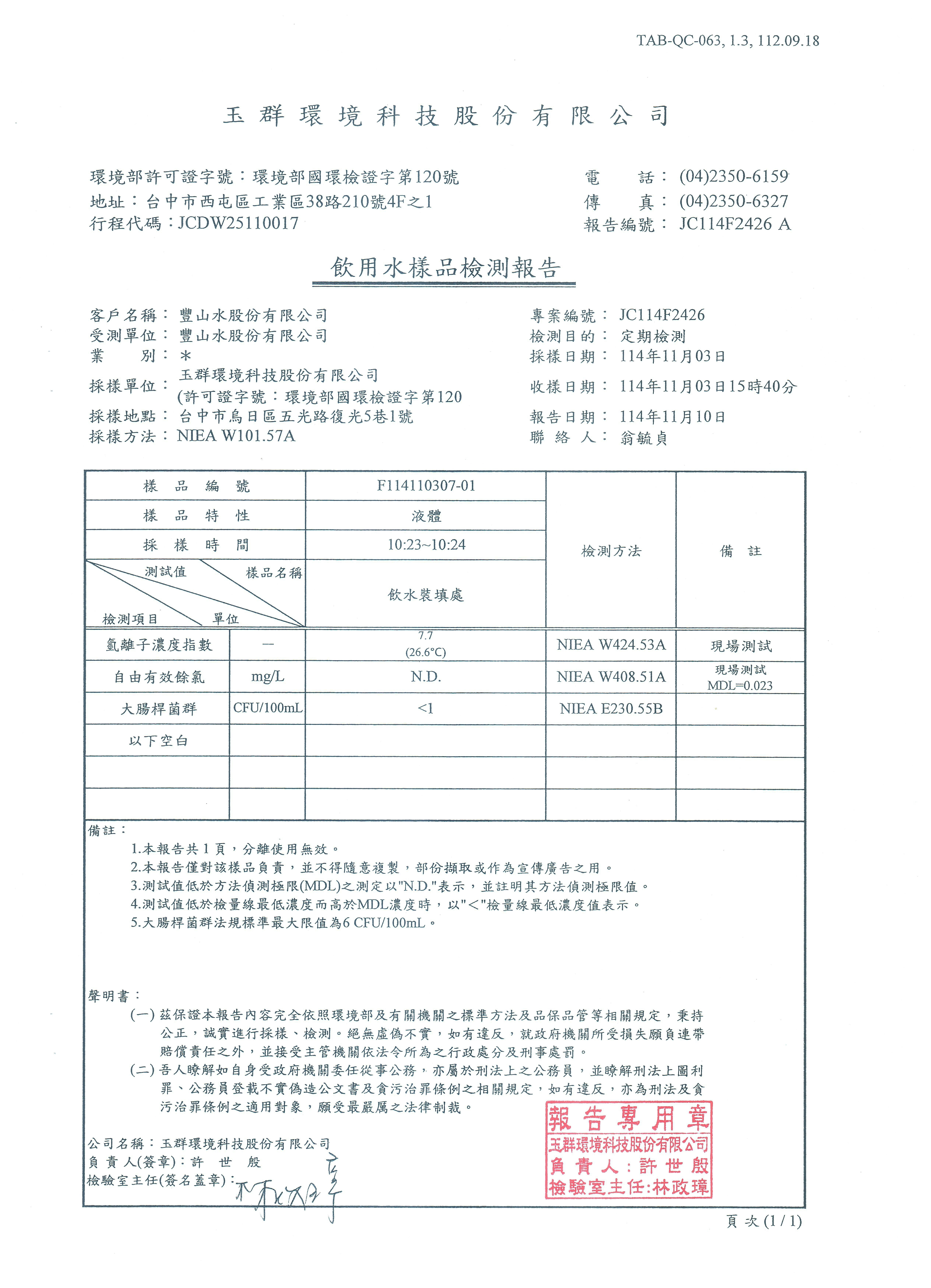 2025年11月份水質檢驗報告 專營:彰化桶裝水/台中桶裝水/南投桶裝水/桶裝水宅配/歡迎來電洽詢